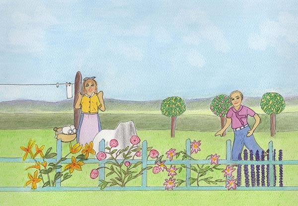 A: I quite like most of my drawings that I have created for my book. My favourites are: Mrs Hopper hanging clothes on the clothes – line. Mrs Hopper discovering a “wild animal” rolling around on her newly washed sheets. Jamie’s Dad sawing wood in the garden, Jamie feeding Jojo in the kitchen, Jamie’s Dream, Jojo’s Toys, Playing with Jojo. Jamie coaxing Jojo into the trailer.